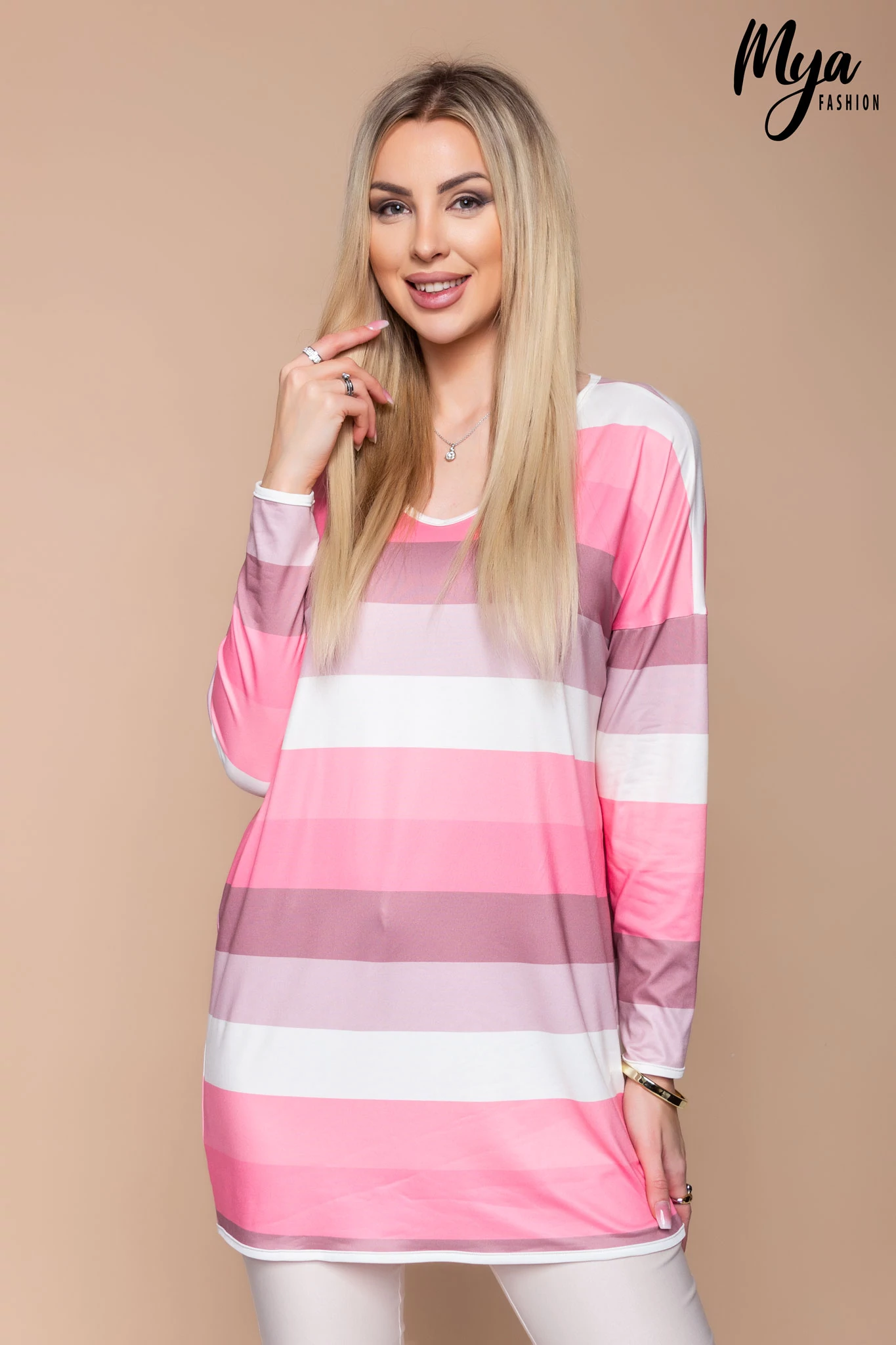 Lezser fazonú, kerek nyakkivágású, alul gumis tunika. Vállán végigszaladó elütő színű passzés díszítéssel és ívelt ujjvégekkel.