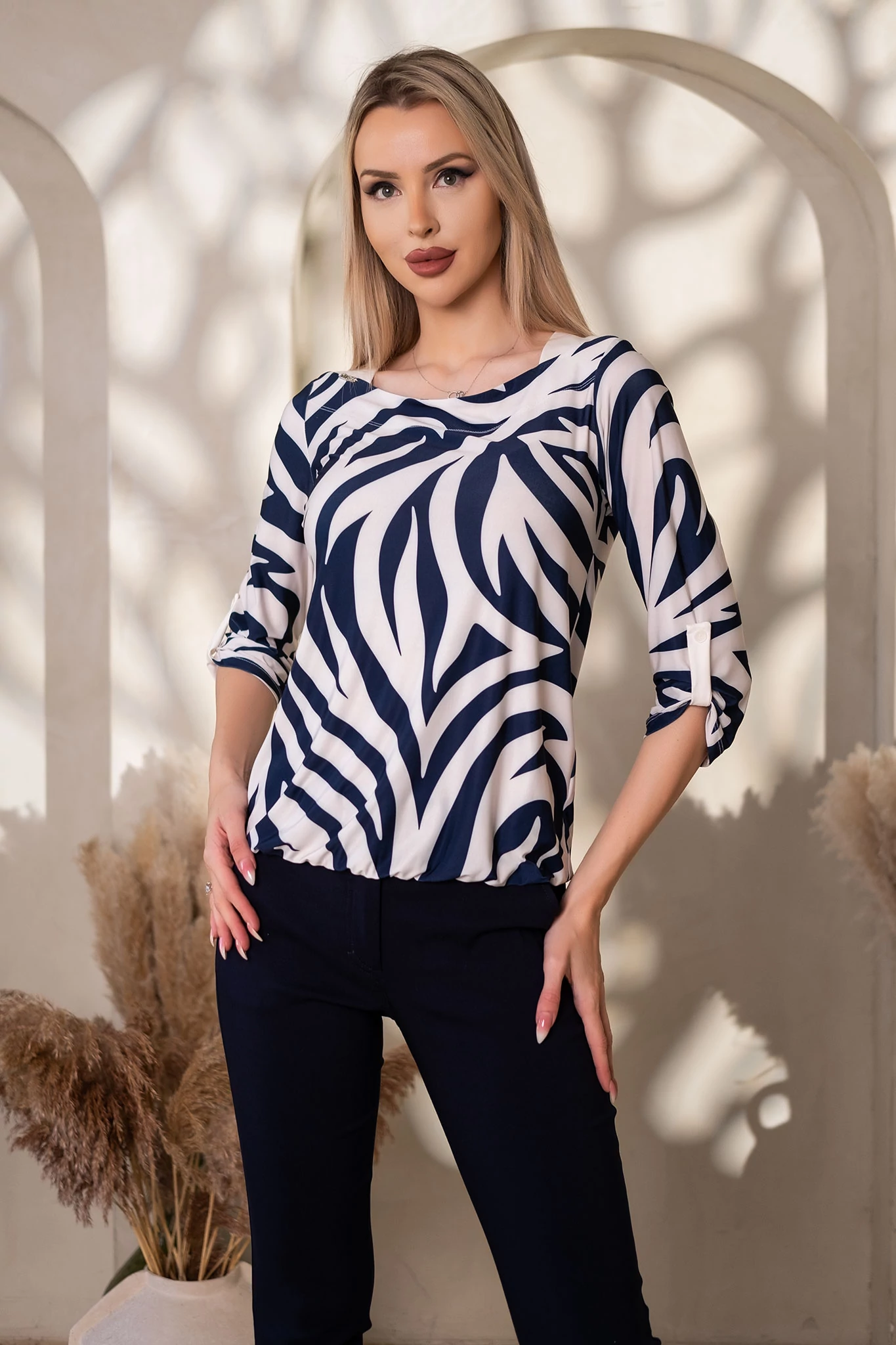 Testhezálló fazonú, 3/4-es ujjú felső. Csónaknyaka elegáns ékbetéttel díszített, ujjai passzéban végződnek.