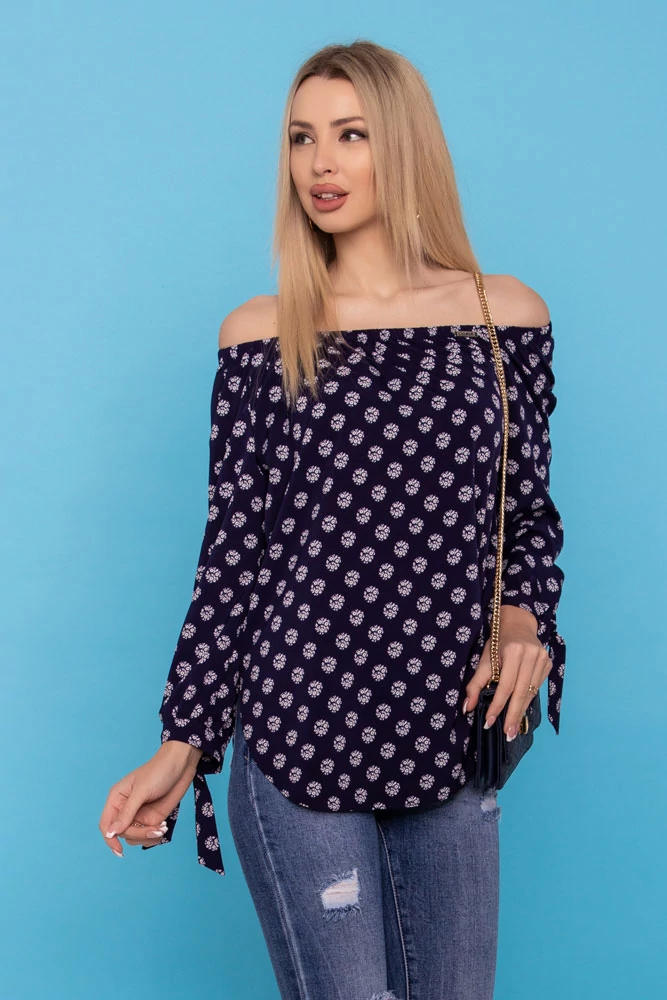 Lezser fazonú, anyagában mintás, selymes-fényes blúz. Hosszú ujjai fodorban és kötőkében végződnek.