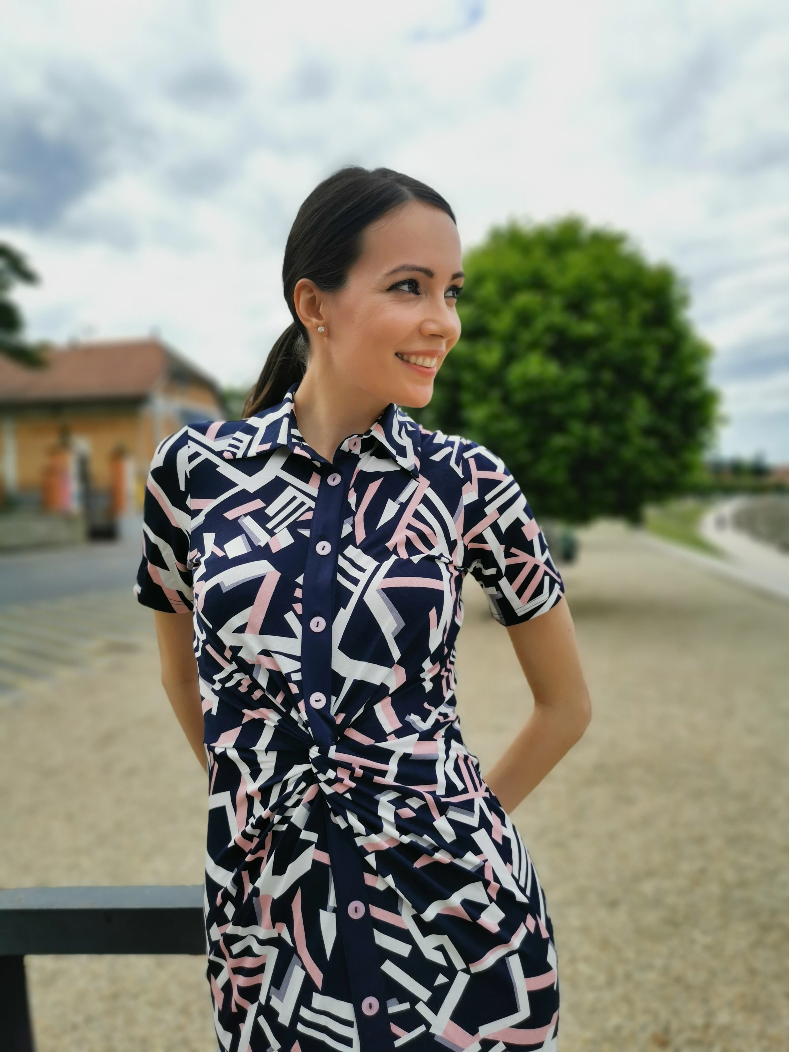 Testhezálló fazonú galléros ruha, derékrészen csavart szabásvonallal.