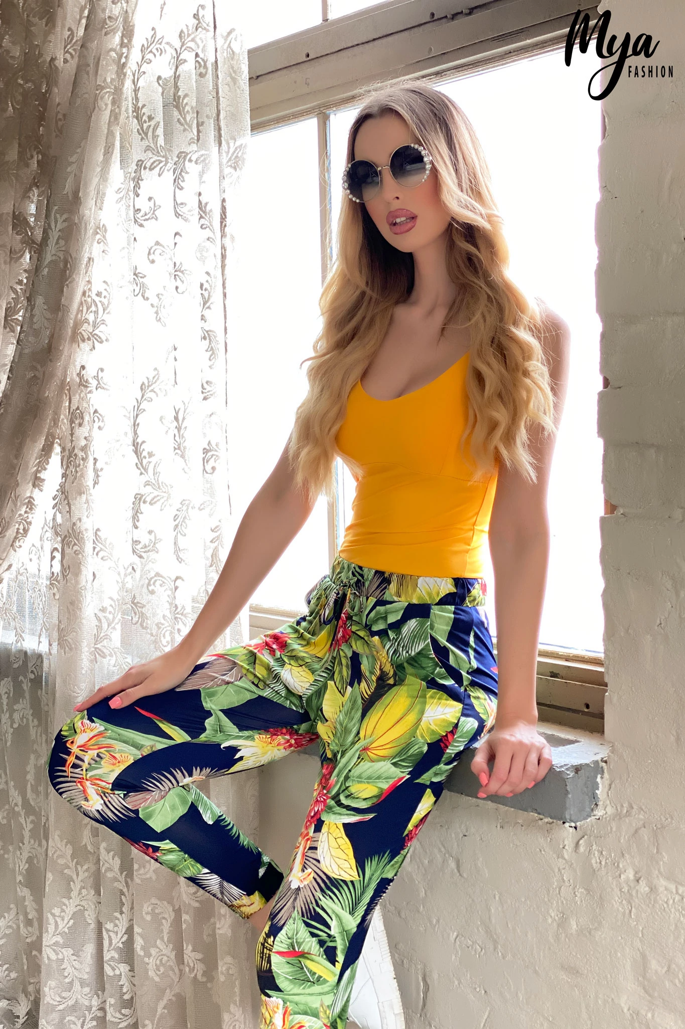 | Szűk fazonú pántos top, mell alatt szabott, eleje felsőrésze mélelve. Vállpántnál apró fémlogó díszíti. Anyagösszetétel: 95% poliészter, 5% elasztán | |
