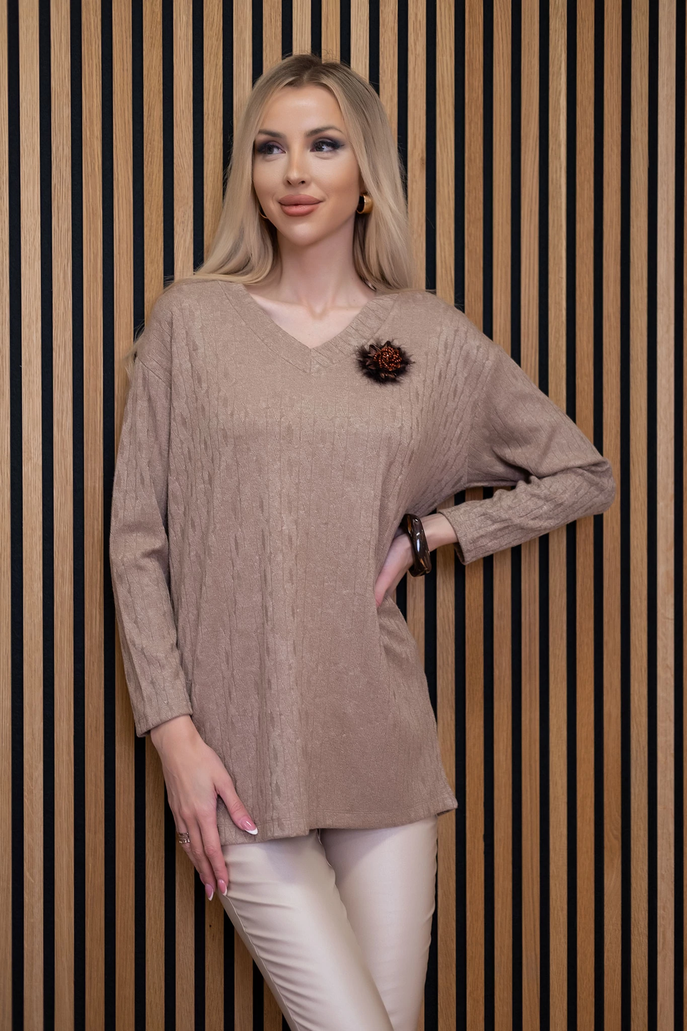 Laza szabású,ejtettvállú tunika, hosszú ujjakkal.