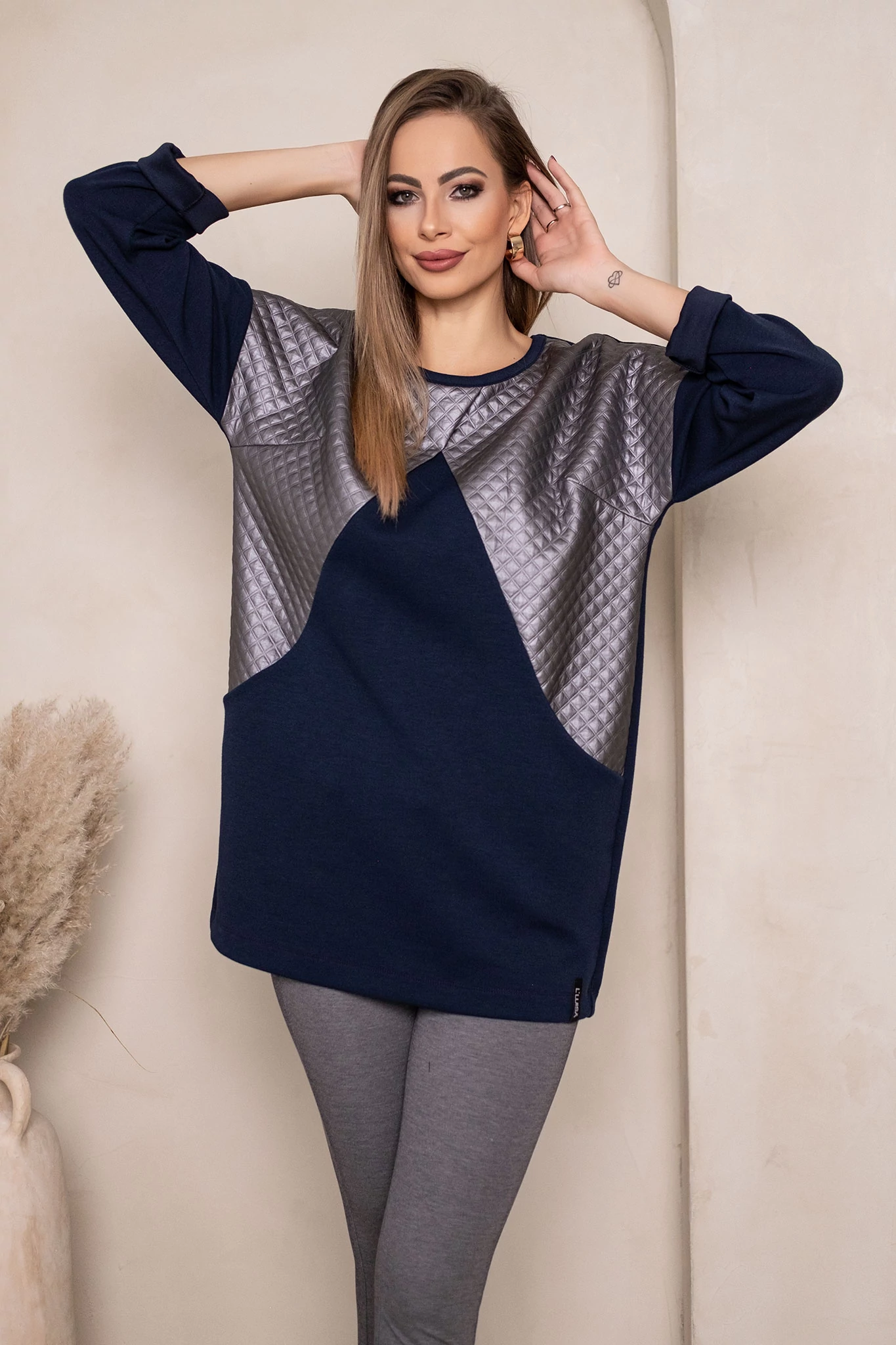 Lezser fazonú, bordás anyagú, kerek nyakkivágású, alul gumis tunika. 3/4-es ujjai passzéban végződnek.