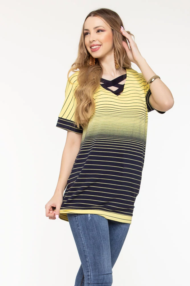 Lezser fazonú tunika, "V" dedkoltázzsal és ejtett vállakkal.